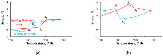 There have been some reports on the shape change due to the reverse martensitic transformation related to shape recovery. The Ti-Ni alloy [7] and the Ti-Ni-Pd alloy [8] change shape in the direction of shrinkage with martensitic transformation, whereas the Hf-Pd alloy [9] and the Fe-Ni alloy [10] change shape in the expanding direction. Furthermore, Wang et al. reported that the amount and direction of shape change in Ti-Ni and Ti-Ni-Fe alloys subjected to cold rolling were significantly different with the reduction ratio in the rolling direction, the transversal direction, and the normal direction [11]. These support that the amount and direction of shape change accompanying martensitic transformations are greatly related to the alloy type and crystal orientation. It is well known that shape memory effects depend on the crystal orientations. Effects of texture orientation on shape memory strain and martensitic deformation in Ti-Ni alloys have been clarified previously [12,13,14]. In addition, it has been reported that the texture orientation significantly influences the stress–strain curve and shape memory effects in Cu-based shape memory alloys [15,16]. Kim et al. calculated the orientation dependence of martensitic transformation strain in the Ti-22Nb-6Ta alloy by combining its texture and lattice-corresponding information, and showed a good agreement with experimental values [17]. Therefore, this method is expected to provide the relationship between crystal orientation and the shape change due to martensitic transformation, leading to the elucidation of the effect in the isobaric test.