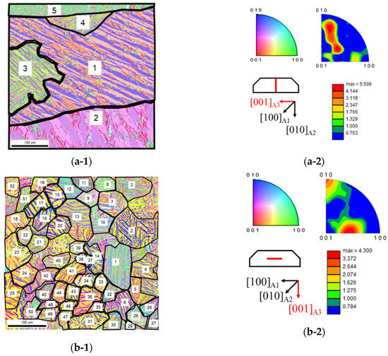 Therefore, six types of lattice-corresponding variants appeared when the parent phase underwent martensitic transformation. When the lattice vector of the parent phase and the set of the pole figure of the martensite were overlapped using the stereo net, the parent phase in the A3 direction could be estimated. This provided each old parent phase crystals, as shown by the bold black lines in Figure 2. Five large grains corresponding to the old parent phase surrounded by the black lines were composed of plate-shaped martensite variants, and those were oriented to (253) and (425) planes, as shown in Figure 2 (a-1,2). On the other hand, the 0° sample in Figure 2 (b-1,2) shows that the crystal grains corresponding to more than 50 old parent phases consisted of plate-shaped martensitic variants, and that those are largely oriented to (101) or (010) planes. From these results, it was found that the shape of the crystal grains in the old parent phases was the long columnar crystal according to the solidification from the hearth side by arc-melting, and the crystal orientations of martensitic variants were different for each cut surface of the button ingot.