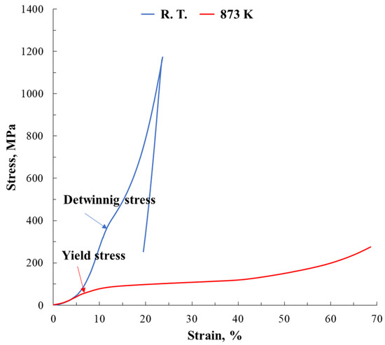 Before the isobaric test, the compression test was performed to investigate the detwinning stress and the yield point in the equiatomic TiPd alloy. Figure 3 shows the stress–strain curves in the compression test at room temperature and 873 K. In the martensitic phase at room temperature, only single yielding was observed. The detwinning and yield stress of the TiPd alloy in the previous study at 758 K [4,5] were 249 and 617 MPa, respectively. Thus, it is considered that the single yielding of 390 MPa obtained at room temperature was the detwinning stress. It seems that the yield point was not obtained due to brittleness of the TiPd alloy at room temperature because fracture occurred during increasing stress. In addition, at 873 K after the reverse transformation of the martensitic transformation, the yield point (0.2% proof stress) was 62 MPa. This was in good agreement with previous studies [4,5].