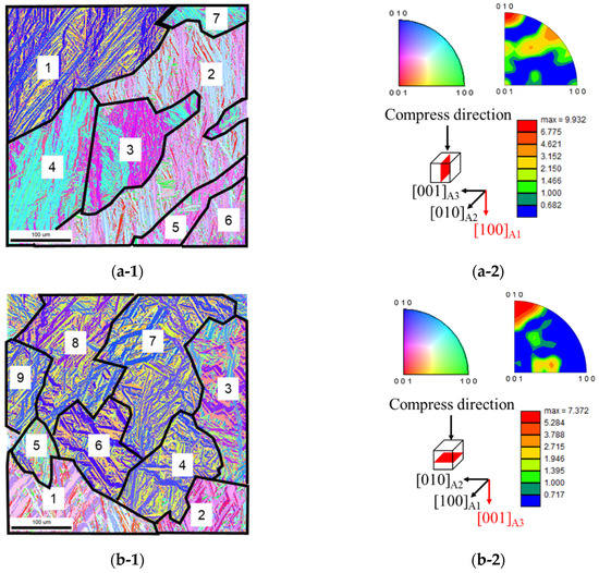 Figure 5(a-1,2) and 5(b-1,2) show the EBSD results of the cross-section and the plan-view in the compression direction after the isobaric test in Figure 4, respectively, where the A1 direction in Figure 5(a-1,2) and the A3 direction in Figure 5 (b-1,2) correspond to the compression direction. In the A1 direction of Figure 5(a-1,2) and the A3 direction of Figure 5(b-1,2), it can be seen that plate-shaped martensitic variants are strongly oriented to (010). This originated from the rearrangement of martensitic variants due to stress-loading [6]. Although the micrographs are not included here, it was found that the texture was more strongly oriented to a (010) plane for the entire sample after the compression test at room temperature in Figure 3. Consequently, it became clear that when the compressive load was applied to the martensitic phase on the equiatomic TiPd alloy, it was strongly oriented to (010). Comparing the old parent phases of the EBSD results after the isobaric test in Figure 5(a-1) and the corresponding cut surface of the 0° sample in Figure 2b, it can be seen that the grain size of the old parent phase after the isobaric test is clearly larger. Since the isobaric test was performed at 50 MPa, it is unlikely that the parent phase became large due to the recrystallization in the martensitic phase itself during the isobaric test. Therefore, the coarsening of B2 grains originated from repeating the forward and reverse martensitic transformation during the isobaric test. Using the same method as in Table 1, the transformation strain for each grain after the isobaric test shown in Figure 5 are summarized in Table 2. The positive and negative values are calculated for each region as in Table 1. The calculated transformation strain does not include the plastic strain, that is, as it corresponds to the values between As and Af in Figure 4. The total transformation strain for the perpendicular and parallel to the compression direction indicated 1.690% and −2.863% as listed in Table 2a,b, respectively, indicating the expansion and shrinking due to the martensitic transformation. The shrinking for the parallel to the compression direction shown in Table 2b was consistent with the isobaric test in Figure 4. Furthermore, when comparing each corresponding transformation strain shown in Table 1 and Table 2, the total strain increased from −0.649% in Table 1a to −2.863% in Table 2b by the isobaric test. Moreover, the expansion for the perpendicular to the compression direction expressed as 1.690 in Table 2a was in agreement with the TMA measurement in Figure 1b. This larger transformation strain and the agreement of direction for shape change is due to the texture with a specific crystal orientation by the isobaric test.