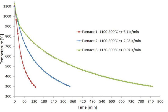For the corrosion experiments, coupons of Hastelloy B3 and BC-1, containing a TIG weld and made of 3 mm thick sheet metal, were provided by HAYNES. Using a disk cutter from ATM Qness GmbH, Mammelzen, Germany, type Brillant 250, pieces with a size of approximately 20 × 80 mm² and 40 g in weight were cut. One set of specimens was investigated in condition as delivered. A second set of specimens was placed inside a diffusion bonding furnace during a run to simulate a heat treatment. For this purpose, a temperature of T = 1100 °C was applied for t = 4 h. Subsequently, the samples were cooled down in diffusion bonding furnace 2. Figure 1 shows the cooling behavior of three diffusion bonding furnaces of different sizes with 20 kN, 200 kN, and 2 MN compressive load, respectively, available at IMVT. It can be seen that the cooling rate of furnace 2 at approx. 600 °C falls below 5 K/min, which is half of the heating rate. This facilitates sensitization, especially with nickel-based alloys, which has an impact on corrosion behavior in aggressive media [11,12,13].