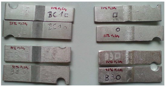 70% sulfuric acid is considered to be more corrosive than 95–97% sulfuric acid because of its water content. Compared to the results obtained for the other four alloys shown in Table 1, especially for the heat-treated condition, for Hastelloy BC-1, superior results were obtained. In Figure 5 it can be seen that the surface of Hastelloy BC-1 has remained almost unchanged, while the surface of Hastelloy B3 shows some pitting attack. In Table 4, weight losses of all samples in 70% sulfuric acid are given.