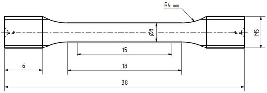 The geometry of tensile test specimens is shown in Figure 7. Tensile tests were performed displacement controlled (dl/dt = 2 mm/min) at RT (room temperature) using a universal testing machine from Instron (type 4505), equipped with a controller unit from Doli. In order to take into account scatter issues, five tests per treatment condition were carried out.