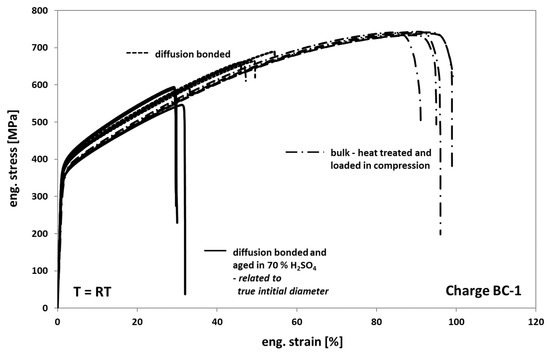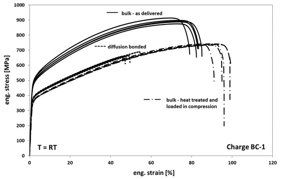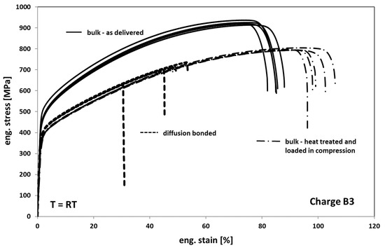 In Figure 8, the results of the tests on as delivered-, heat-treated, and compressed- and diffusion-bonded samples are depicted. When comparing the as delivered condition of bulk material with the heat-treated condition it can be seen that the annealed samples show a decrease in strength of about 20–25% and an increase in ductility of about 20%. Accordingly, the annealed material reveals a slightly less pronounced hardening behavior. The change in deformation behavior can be generally traced back on both recovery and recrystallization/grain growth processes (compare Figure 3 and Figure 4) occurring during exposure to high temperature.