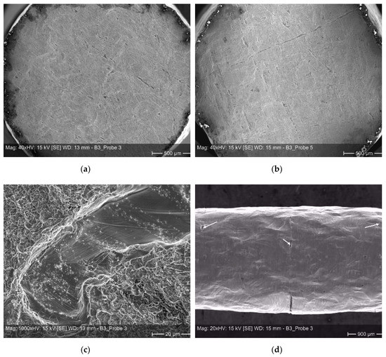 Examples of such weak spots based on scratches or dents etc. on the individual sheets are shown in Figure 9. In Figure 9a,b one can see an overview of fracture surfaces exhibiting a multitude of weak spots. When comparing both micrographs it becomes clear, that the high scatter of the elongation at fracture values is related to the entire size of the non-bonded areas, lowering the real load bearing cross-sections. While sample 5, depicted in Figure 9b, reveals an elongation at fracture of approximately 30%, sample 3, depicted in Figure 9a, reveals an elongation at fracture of almost 50%. A closer view on a fracture surface (Figure 9c) is manifesting the general ductile nature of failure within well bonded sections in form of dimples, here, surrounding a weak spot. Non-bonded areas are also located at the surface of a sample. Accordingly, with increasing deformation the occurrence of smaller surface cracks is visible in several bonding planes (Figure 9d).