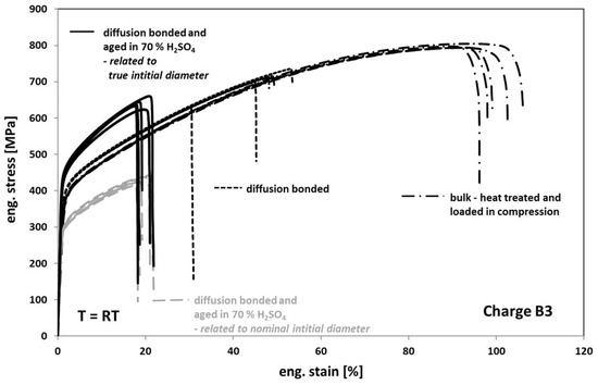 Compared to the heat-treated bulk samples, the diffusion bonded samples exhibit a comparable deformation behavior but a significant decrease in elongation at fracture of about 50% on average. The earlier onset of failure is obviously a result of several weak spots within the bonding planes in the form of non-bonded areas that act as cracks.
