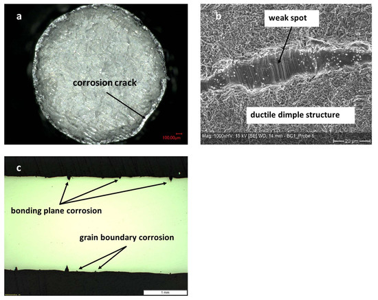 When comparing the tensile test results obtained from tests on diffusion bonded samples, aged for 1000 h at 100 °C in 70% sulfuric acid with the results obtained on non-aged bonded samples (Figure 10), one can see a further strong decrease of the elongation at fracture to an average value of about 20%. Additionally, the stress level also significantly decreased (Figure 10, interrupted grey deformation curves). However, this finding is based on the fact, that the stress calculation of the engineering stress is usually related to the nominal initial cross-section. In fact, based on a much stronger corrosive attack into the volume than expected when viewing Figure 6a, a real initial cross-section after aging is much smaller as one can see in Figure 11. Accordingly, by determining the average depth of the corrosion cracks inside the failed bonding planes, the initial cross-sections and subsequently the stresses were re-calculated. Now, the stress level of aged samples is significantly higher than the one of non-aged samples (Figure 10, black deformation curves). This might be related to the formation of an inhomogeneous distributed multiaxial stress–strain-field during loading—see Figure 11c, concave shaped surface between the bonding planes. The pronounced notch effect and the resulting stress concentrations can also explain the decrease of the elongation at fracture values.