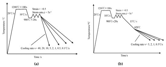 Schematic diagram of the thermal simulation experiments. (a) Dynamic continuous cooling transformation; (b) effects of the cooling rate during coiling and after coiling.
