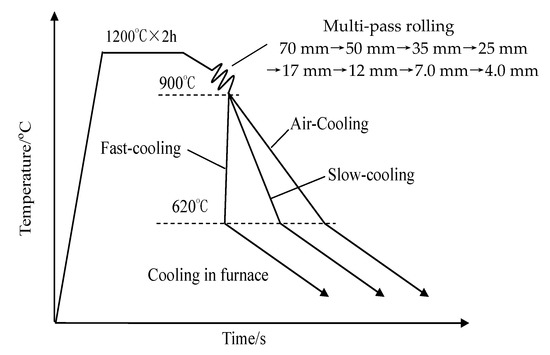 Hot rolling experiments were conducted on a Ф450 mm × 450 mm two-high reversing hot mill. The maximum rolling force and roll gat are 4000 kN and 170 mm, respectively. The rated power of main drive motor is 400 kW. The multi-function cooling system is installed on the delivery side of the mill. A slab with 110 mm thickness was reheated to and maintained at 1250 °C in a furnace for 1 h, then rolled to a plate with 12 mm thickness. The plate was cooled to room temperature by air, after rolling. The cylindrical samples, with a size of Ф8 mm × 15 mm, were cut from the plate. A schematic diagram of the experiment is presented in Figure 1.