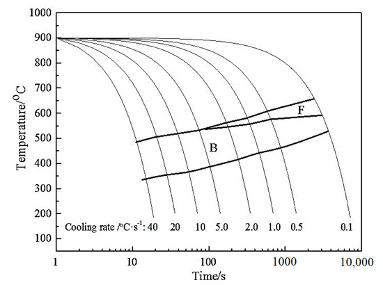 Dynamic Continuous Cooling Transformation (CCT) curve of experimental steel.