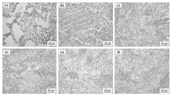 Microstructures at different cooling rates: (a) 0.1 °C/s; (b) 1.0 °C/s; (c) 5.0 °C/s; (d) 10 °C/s; (e) 20 °C/s; and (f) 40 °C/s.