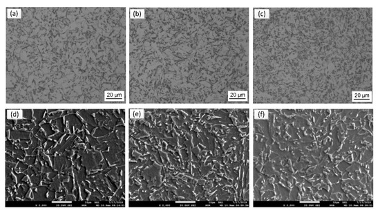 Optical micrograph (OM) and scanning electron micrograph (SEM). (a,d) Air-cooling; (b,e) Slow-cooling; (c,f) Fast-cooling.