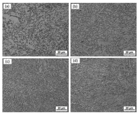 Optical micrograph (OM) of samples with different cooling rates, after coiling: (a) 0.5 °C/s; (b) 1 °C/s; (c) 2 °C/s; (d) 5 °C/s.