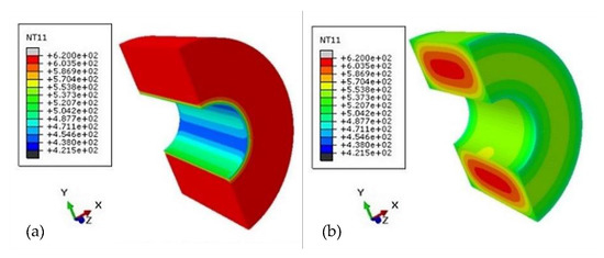 The initial temperature of the coiler drum is assumed to be 50 °C, and the environment temperature is assumed to be 20 °C. The difference of the strip temperature, after laminar cooling along the transverse direction, is ignored. The initial temperature of the strip, before coiling, is set to 620 °C (coiling temperature). The heat transfer mechanism of the inner layer of hot-rolled coil between the coiler drum is heat conduction during the coiling stage. The heat transfer mechanism of the inner layer surface of hot-rolled coil is heat conduction during the coil discharged stage. The heat transfer mechanism of the outer layer surface and side of the hot-rolled coil includes heat radiation and air convection, and the heat loss due to radiation is much higher than that due to air convection. Radiation heat losses from the strip to the environment can be calculated using the Stefan–Boltzmann equation [14]: