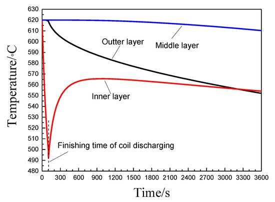 As mentioned above, reducing the cooling rate before and after coiling can reduce the strength of the experimental steel. Therefore, the U-shaped cooling process is proposed in this paper to improve the longitudinal performance uniformity of hot-rolled coil, in which the target coiling temperatures of the head and tail parts are increased and are higher than that of the body part. The cooling parameters of the head and tail parts were determined based on the simulated temperature field of hot-rolled coil. The temperature-time curves in different positions of the inner and outer layers are shown in Figure 10 and Figure 11, respectively.