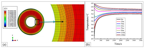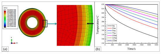Temperature-time curve in different positions of the outer layers: (a) temperature field; (b) temperature evolution.