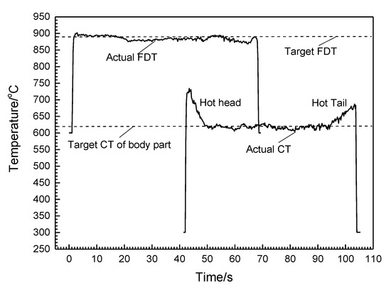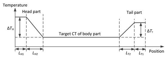 In Figure 11, it can be seen that the temperature of the outer layers decreases with the cooling time increment, due to thermal radiation and air convection. The temperature difference between the part within 20 m from the strip tail end and the strip body part is below 50 °C 1 h after coiler discharging. However, the temperature difference between the part beyond 100 m from the strip tail end and the strip body part is no more than 20 °C 1 h after coiler discharging. Therefore, the cooling parameters of the tail part, ΔTT, LT1, and LT2, are set to 50 °C, 20 m, and 80 m, respectively, as presented in Figure 12 and Table 6.