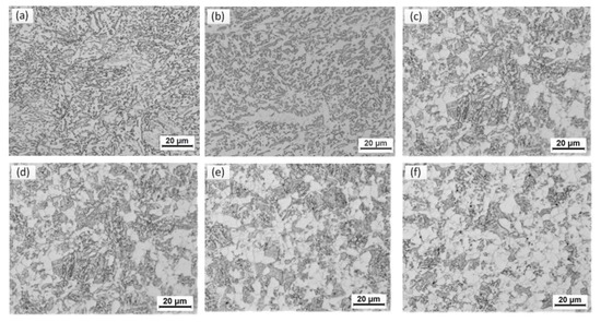 Microstructure of the rolled strips, before and after the U-shaped cooling process application: (a–c) Before the U-shaped cooling process application; (d–f) after the U-shaped cooling process application; (a,d) head part; (b,e) tail part; (c,f) body part.