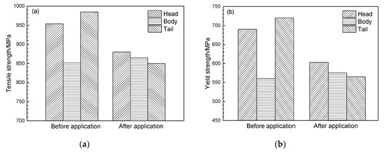 The mechanical properties of hot-rolled coils, before and after the application of U-shaped cooling. (a) Comparison of the tensile strength; (b) comparison of the yield strength.