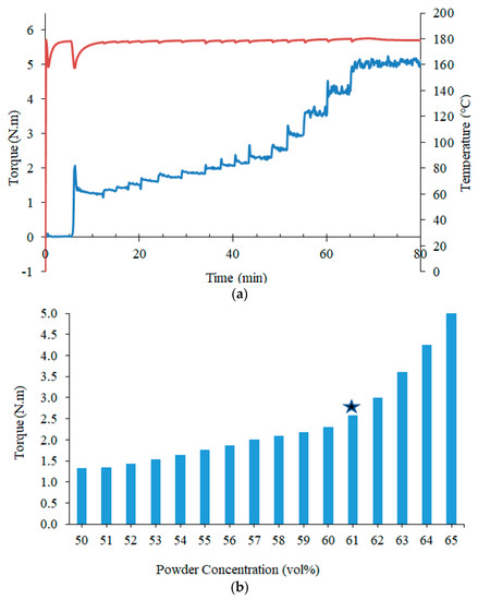 The determination of CPVC can be carried out through the techniques of torque rheometry or capillary rheometry. The first technique involves either thermal softening of the binder or oil absorption and the torque values. The torque values are obtained by a gradual powder addition procedure during mixing (Figure 2a) and are plotted against powder concentrations (Figure 2b). The CPVC is the volume for which the torque increases suddenly (for example, the value marked with the star in Figure 2b) [41,42,43]. In respect to the application of capillary rheometer, the flow activation energies are plotted against powder concentrations [44,45]. The CPVC is the one corresponding to the feedstock with less activation energy, which means lower viscosity sensitivity to temperature variations and, thus, a higher possibility of manufacturing defect-free parts. The capillary rheometry technique can involve the evaluation of other rheological properties, such as shear viscosity and shear rate [42,46,47].