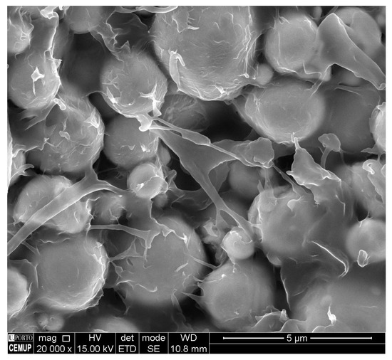 The homogeneity of the prepared feedstocks should be assessed to guarantee the production of a perfect part. The evaluation of this characteristic can be done through the analysis of the evolution of torque versus time during the preparation of the mixture, supported by scanning electron microscopy (SEM). This last technique shows that a well-prepared feedstock must have powders covered with a thin layer of binder (as illustrated in Figure 3) [51]. In the torque graph approach, it is assumed that the homogeneity of the feedstock is achieved when the torque variations reach a steady state, which is affected by the composition of the binder used [42,52], the speed and time of mixing and the powder concentration [23,51,53]. Homogeneity can also be evaluated by checking if the measured density of a feedstock sample is analogous to its theoretical density. The gas absorption technique can determine the density of the feedstock produced, which may be essential to determine whether different batches of the same feedstock have similar values [9,54].