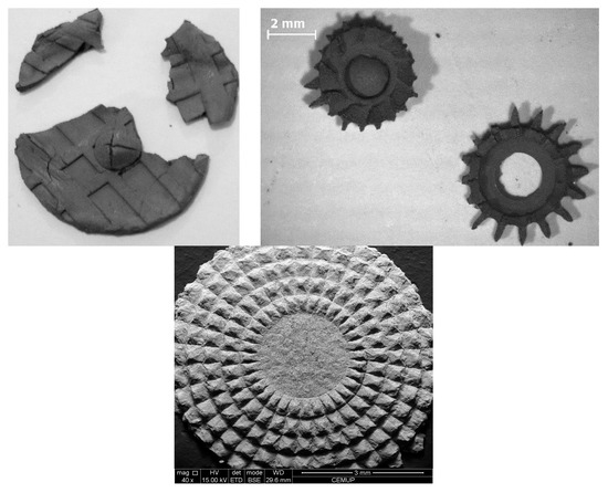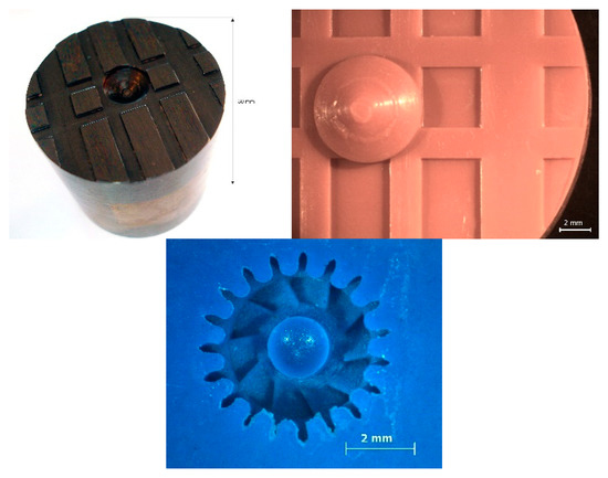 The composition and design of the mold used for the embossing play a vital role in a successful demolding, considering the aspect ratio and geometry of the details/features to be replicated. During the last decade, different materials have been tested for the mold: from metallic to various elastomers. Figure 5 shows examples of some molds used. As the embossing temperature of the feedstocks was low (between 100 and 240 °C) and the series produced were small, elastomers could be used in the mold design. These materials have proved to be a solution for the demolding stage, allowing the release of green parts with guarantee. In fact, the release stage can be improved using these softer molds, as reported in [27], where different geometries and materials were tested. The use of release agents, which enhances the release stage, has been reported [13,34] even when elastomeric molds are used. These agents have the purpose of controlling or eliminating the adherence between the green parts and the mold.