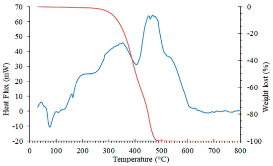 Combination of TGA and DSC results obtained by the application of a heating rate of 10 °C/min in Ar atmosphere for a commercial binder material (M1) (adapted from [16]), the red curve represents the weight loss and the blue curve represents the heat flux.