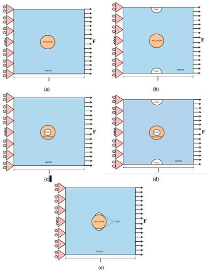 Schematic representation of the unit cell model and its boundary conditions. Particle reinforcements are considered square and circular. (a) Pore free matrix and pore-free particle. (b) Porous matrix and pore-free particle. (c) Pore free matrix and porous particle and (d) porous matrix and porous particle. (e) Porosity at particle–matrix interface. The triangles on the left side represent constraints displacement in the node.
