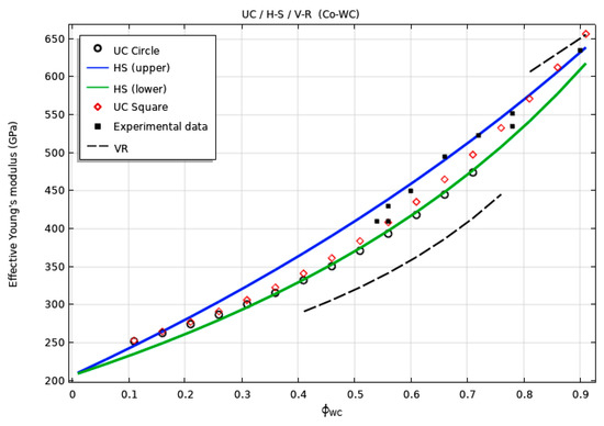 The numerical methodology was validated by comparing the numerical effective elastic modulus of the composites against experimental data published for the cemented carbides, which consist of WC particles distributed in cobalt [25]. This study considers small and large granules, with reinforcement volume fraction ranging from 50–90% and the elastic modulus were determined by resonant ultrasound spectroscopy (RUS) and impulse excitation. The elastic modulus predicted from the bounds of Hashin–Shtrikman (H–S) and Voigt–Reuss (V–R) is also used as a reference. The H–S micromechanical model is perhaps the most widely used because of its accuracy. Bounds are the tightest possible ones from a range of composite moduli; the two-phase material moduli can be obtained as
