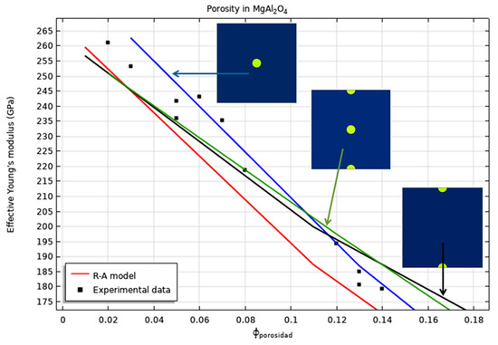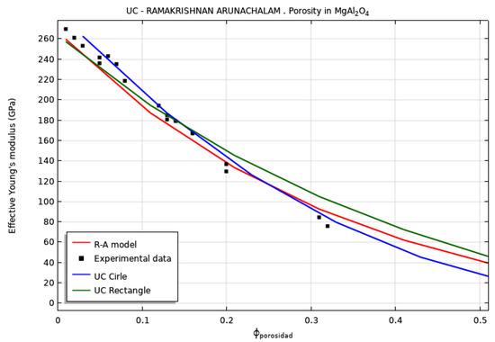 The information plotted in Figure 2 shows that the numerical model correctly predicts the stiffening effect. The validity of the developed numerical methodology was evaluated for the prediction of the effective Young’s moduli when one phase of the composite has a zero-moduli and zero-Poisson’s ratio. The analytical model for micromechanics of porous mediums proposed by Ramakrishnan and Arunachalam (R–A) was used as a reference. Experimental data reported in [16] was used to determine the accuracy of the numerical methodology in capturing the presence of pores in the composite. The R–A model was established considering that the dispersed phase of the composite has zero moduli, which means that in the porous area, the stress is zero but not the strain, the equations that describe this behavior are the following