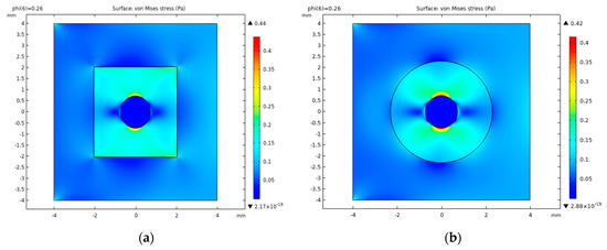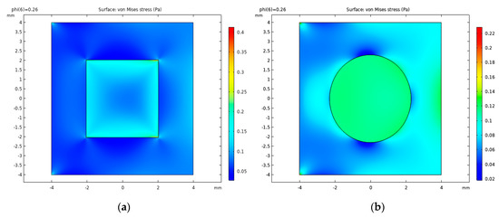 The porosity significantly affects the mechanical performance of the composites. The porosity increases as the weighting percentage of particles increases. In [21] it was found that the porosity content of the Al composites varied from 1.01% to 2.69% with the increased SiC wt % from 0% to 25%. A parametric study was performed, where a similar increase-relationship between the amount of porosity and the content of SiC particles is maintained; where the porosity increases as the volume fraction of reinforcement do. Porosity content (volume fraction) varies from 0% to 3.1% with SiC particle added from 1% to 31%. Figure 8 shows the surface plots of von Mises stress in the microstructure when the Al-matrix is porous, and the SiC-particle is fully dense. These results are based on the microstructure shown in Figure 1b. The maximum stress obtained in the square particle is about 0.5 MPa (Figure 8a). Whereas, for the circular particle, the maximum stress in the particle is 0.14 MPa (Figure 8b). In both Al-matrixes (square and circular particle) high-stress concentration around the pore is observed, with a value of about 0.2 MPa, however, the stress in the matrix is bigger than the stress in the particle in the case of the circular reinforcement. As the stress in the SiC square particle is higher than that of the Al-matrix, the load transfer remains effective despite the presence of pores in the Al-matrix. In Figure 8b it is shown that the stress gradient at the interface of the SiC circular particle and Al-matrix is low; namely at some points of the interface, the matrix and the reinforcement endure the same load.