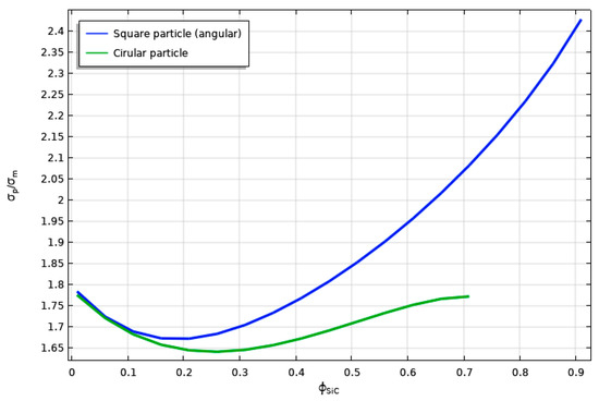 The SiC square or angular particle reinforced Al matrix composites endure more load than reinforced with SiC round particles as shown in Figure 7. This plot shows the stress ratio (stress in the particle and the stress in the matrix, ) as a function of the reinforcement volume fraction. It is considered that the composite remains elastic independently of the applied load [31]. It is found that the square and circular particles endure the same load to the volume fraction up to 11%. However, above this reinforcement content, the angular particle endures more load. Then, the effective elastic modulus of the MMC is independent of the particle morphology when the reinforcement content is lower than 11%.