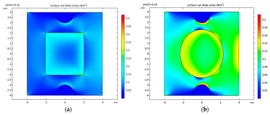 Von Mises stress distribution of SiC porous-particulate filled aluminum matrix under tensile loading. (a) Square shape and (b) circular shape. The volume fraction of SiC particles and pore content is 26% and 2.6%, respectively.