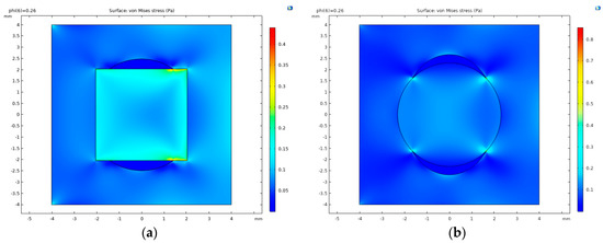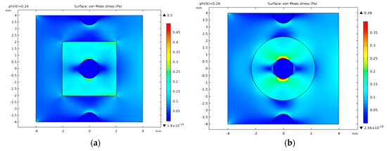 Figure 11 shows the surface plots of von Mises stress in the microstructure when the pore is located at the particle-matrix interface. For the square particle (Figure 11a), the stress in the particle (0.3 Pa) is greater than the stress in the matrix (0.09 Pa), which shows that strengthening of the composite is by transfer load from the soft Al-matrix to the SiC hard particle. The stress is concentrated at the particle corners, but the highest stress concentration (0.5 Pa) is located at some contact points between the particle, matrix, and pore. In the case of the SiC circular particle (Figure 11b), the stress concentration is at all the contact points among the particle, matrix, and pore, and when compared to the square particle, the stress intensity is two-fold. Moreover, the stress level in the particle (0.13 Pa) is a little bit greater than that in the matrix (0.11 Pa). Therefore, in the case of the circular particles, the pores located at the particle–matrix interface significantly affect the transfer load mechanism, whereas in the case of the angular particles, the transfer load remains effective still because a relatively high proportion of the externally applied load is endured by the particle. As mentioned in Ray [23] this type of porosity aid the debonding of particles from the matrix under low stress, because the interface damage starts to develop since the contact points among the particle matrix and the pores act as a stress concentrator, as shown here.