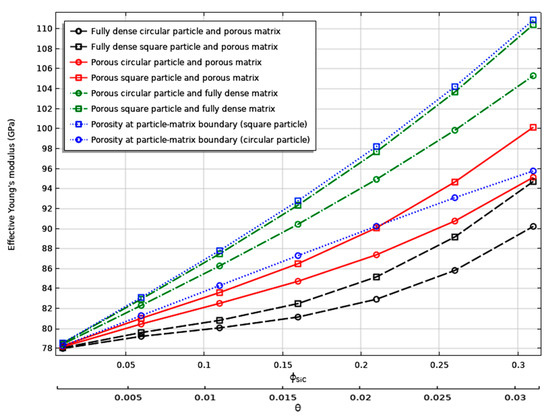 It is found that square particles carry much higher stress than matrix in the case of porous matrix and fully dense particle (Figure 8a). Whereas, in the case of the circular particle, it carries much higher stress than matrix when the particle is porous, and the matrix is fully dense (Figure 9b). From the previous results, it can be seen that despite the presence of pore in the composite, stress transfer from the soft matrix to the hard particle is effective in all cases, except in the case of fully dense circular particle and porous matrix (Figure 8b), where the matrix endures more load than the particle. Then, the transfer load is lowered, and this is reflected as a reduction in the elastic modulus of the composite (Figure 12, black line with circular markers). Figure 12 shows the results gathered from the parametric study to demonstrate the effect of the porosity in the elastic modulus of the SiC particle reinforced Al matrix. In this parametric study, porosity content varies from 0% to 3.1% with SiC particle added from 1% to 31%. For the studied cases that consider coexistence of pores inside the particle and the matrix, the greater impairing on the Young’s modulus of the composite was found to be in the case of the fully dense particle and porous matrix. The lower impairing on the elastic modulus of the composite is for the porous particle and fully dense matrix. Intermediate values on the impairing of the Young’s modulus of the composite are for the case of porous particle and porous matrix, as well as the pore located at particle–matrix interface when the particle is circular. For the square or angular particles, the pore within the particle affects the load transfer mechanism in a similar manner to the pore located at the particle matrix interface. These results mean that the elastic property of the composite is more sensitive to the porosity in the matrix because the particles are stiffer than the matrix. The declining trend for the elastic moduli is consistent in both the angular and circular particle shapes. In all cases, the square or angular particles strengthen the composite when compared to the circular particles. From the results, it is concluded that the disrupting of continuity in the composite by the presence of pores causes elastic relaxation of the matrix, which leads to the reinforcement particles (angular or circular) undergoing increased loads. Consequently, this leads to a relaxation in the particle, and there is a drop in its stress gathering capability, and thus the resulting effective elastic modulus of the Al/SiC composite decreases. Therefore, the data indicate that the porosity in the composite matrix is the main cause in the impairing of the elastic modulus in MMC. In practice, the scatter of experimental data on the elastic modulus is caused mainly by the porosity in the composite because the difficult of experimentally reproducing the same porosity in the composite every test. Table 2 shows how the % increment in porosity in the matrix reduces the elastic modulus of the composite. Moreover, despite the volume fraction of the reinforcement is increased, if the porosity increase, the impairing on the Young’s modulus is increased also. Therefore, the porosity plays a significant role in the strength of the composites, and for a given porosity in the matrix, it impairs the Young’s modulus in the same way independently of the shape of the SiC-reinforcement.