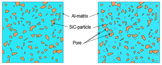 For the microstructures having different phases like hard ceramic particles and pores, it is desirable to predict strength properties for the development of high-performance materials. Porosity in MMC can greatly influence the material properties and is mainly caused by manufacturing processes, thermal cycles, and both distribution and percentage particles [7,8,9]. For instance, enhancement of strength is affected in the interface causing crack initiation sites, which was evidenced in Hassani’s study at varying milling times with different particle sizes and amounts. The visualization of porosity and voids employed specialized techniques such as nondestructive laser-ultrasonic spectroscopy where Podymova et al. [10] proposed a calibration curve for porosity evaluation as this defect compromise composite strength. Other techniques, such as neutron and synchrotron diffraction, were voids and pores are easily observed and micro stresses can be detected. Previous investigations conclude that thermal fatigue damage is produced by the porosity presence and can influence the coefficient of thermal efficiency behavior in MMC, tensile and fatigue properties are also affected [8,11]. Consequently, porosity content decreases mechanical properties of MMC—such as tensile strength, Poisson ratio, and Young’s modulus.