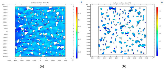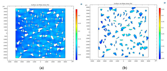 Figure 14a,b show the surface plots of von Mises stress in the Al-matrix and the SiC particles, respectively. The stress in the particles is larger than in the matrix, and the stress in the particles is mainly concentrated in the sharp angular corners. These results are in agreement with the stress fields shown previously in Section 3.2.1, Section 3.2.2, Section 3.2.3, Section 3.2.4 and Section 3.2.5. Moreover, the stress field magnitudes are similar for the matrix as well as for the particles. The Young’s modulus of the composite using this microstructure is 91.06 GPa, while Young’s modulus predicted by the unit cell (used in Section 3.2.1) is 89.35 GPa. Evaluating the difference, this value is lower than 2%.
