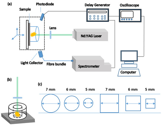 The experimental setup of the laser-induced breakdown spectroscopy used for the study of the cavity confinement is shown in Figure 1a. We employed a Q-switched Nd:YAG laser system operating at its fundamental wavelength of 1064 nm to produce the plasma. The repetition rate of the laser was 10 Hz, and a pulse duration was 10 ns. The laser was focused to a spot size of approximately 0.42 mm in diameter on the target sample by a plano-convex lens with a focal length of 15 cm. A pyrometric detector (Ophir Optronics Solutions Ltd., energy sensor, L50 (300) A-LP2-65, P/N 7Z02782, Jerusalem, Israel) was used to measure the three different laser fluences used in this experiment (12.9, 18.1 and 23.3 J cm−2). The samples used in this investigation were titanium and magnesium alloys with percentage purity of 99.98% and 99.99%, respectively. We used two different cavities with three different diameters and three different sides, circular and square cavities, respectively. The depth of all the cavities were 7 mm. The target samples were mounted on a 3D translation stage, and the cavities were tightly fixed on the surface of the target samples. The plasma was generated in the exact center of the cavity. The light emitted by the plasma was captured by the light collector through an optical fiber (50 µm core diameter) which was connected to echelle spectrometer (Andor Tech., Mechelle 5000. Wavelength range of 200–975 nm, wavelength accuracy of ±0.05 nm, focal length of 195 mm and high resolution power up to 6000 and with spectral resolution of 5000) with an inbuilt intensified charge-coupled device (ICCD) camera (1024 × 1024 pixels iStar DH-334T from Andor Technology). The delay generator (Stanford Research System, model DG645, Carlsbad, CA, USA) was synchronized with the ICCD to delay the time between the laser pulses, the photodiode was used to trigger the ICCD, and the signals were monitored by the digital oscilloscope (YOKOGAWA, digital oscilloscope DL9140, Tokyo, Japan). The spectra data was an average of 15 laser shots. The experiment was conducted in air at atmospheric pressure.