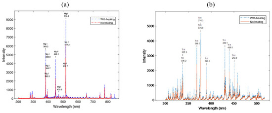 We recorded the emission spectra of the Mg and Ti lines at a laser fluence of 12.9 J cm−2 and delay time of 12 µs in air at atmospheric pressure with and without sample heating. We compared the MgI-518.3 nm spectral line for the case of sample temperature of 100 °C to the one without the sample heating and their emission intensities were recorded as 8934 and 6140, respectively, with an enhancement factor of 1.46. From this we observed that the emission spectra of the Mg lines were more enhanced with a sample temperature of 100 °C than the spectra without sample heating as shown in Figure 3a. In addition, the Ti spectra with a sample temperature of 100 °C and that without sample heating are presented in Figure 3b. By comparing the Ti II-376.0 nm spectral line of the case of 100 °C sample heating to the one without sample heating. The emission intensities of the Ti II-376.0 nm spectral line were recorded as 4535 and 3079 for the 100 °C sample heating and the one without sample heating, respectively. The Ti spectra recorded an enhancement in the spectral intensity with sample temperature of 100 °C.