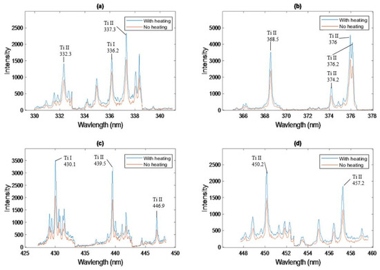 In order to further analyze the Ti spectra in Figure 3b we compared the Ti spectral lines with four different spectral regions ranging from 330–340 nm, 365–377 nm, 427–448 nm and 447–460 nm as presented in Figure 4 and we found out that the Ti spectra with sample temperature of 100 °C were improved within all the spectral regions.