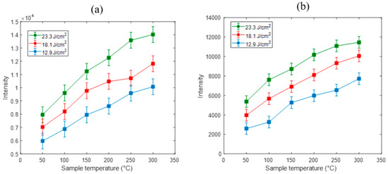 The temperature dependence of the Ti spectra is also presented in Figure 5b. By increasing the sample temperatures, the emission spectra intensity of the Ti II–376.2 nm were increased. At a sample temperature of 50 °C the spectral intensities were recorded as 2484, 3977 and 5332 with laser fluences of 12.9, 18.1 and 23.3 J cm−2, respectively. The maximum peak intensity of the Ti II–376.2 nm lines were obtained as 11,364 with a sample temperature of 300 °C and a laser fluence of 23.3 J cm−2. By comparing the peak intensity of the lower sample temperature (50 °C) to the higher sample temperature (300 °C), we observed that the higher sample temperature (300 °C) was massively enhanced. We observed that the emission spectra of the Mg and Ti spectral lines were more enhanced using a lower laser fluence and higher sample temperature as compared to those using a lower sample temperature and higher laser fluence.