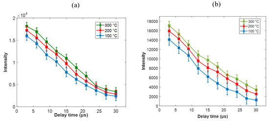 Figure 6a depicts the temporal evolution of the Mg I-518.4 nm spectral peak intensity as a function of the delay time at different sample temperatures (100, 200 and 300 °C). As seen from Figure 6a, the peak intensities of the Mg I-518.4 nm lines recorded its maximum peak intensity as 18,101 at a delay time of 3 µs and then drops significantly to spectral intensity of 3229 at a delay time of 30 µs. By comparing the emission peak intensities of the case of 100 °C to the case of 300 °C we observed that the emission peak intensities of the latter were substantially more enhanced than those of the former. It can also be seen from the figure that the peak intensities of the Mg I−518.4 nm lines drop tremendously with increasing delay time.
