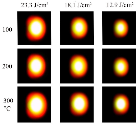 Figure 7 represents the images of the plasma plume of the Mg sample acquired by a camera at different sample temperatures and laser fluences of 12.9, 18.1 and 23.3 J cm−2. Increasing the sample temperature also increases the size of the plasma plume. With the same laser fluence, the size of the plasma plume increases with higher sample temperatures than that of lower sample temperatures. In addition, when the air around the Mg sample surface is heated, it causes a hydrodynamic effect, which decreases the air density near the surface of the Mg sample. Therefore, increasing the laser fluence also improves the plasma plume expansion of the generated plasma. Moreover, when the sample temperature increased, the air density surrounding the Mg sample surface reduced. The decrease in the air density resulted in a decrease in the radiation process and lower collision probability. Furthermore, as the plasma expands, the plasma pressure also decreases [40,41,42,43]. From Figure 7 we observed that the higher sample temperature lead to a substantial change in the plasma dynamics. Therefore, the Mg plasma plume expanded more with the sample temperature of 300 °C than that of the 100 and 200 °C sample temperatures. We found that the size of the Mg plasma plume had a linear relationship with the sample temperatures. Likewise, the plume expansion increases with higher laser fluence.