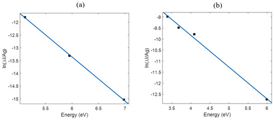 where and are statistical weight and transition probability while , and are wavelength, intensity and energy of the upper state, respectively. N0 and are the number density and Planck’s constant. and are the speed of light and partition function respectively. and are the Boltzmann’s constant and the electron temperature. The plot of Equation (1) yields a linear graph of the form , where is a constant, , and the slope . The relevant spectroscopic data for the Mg and Ti lines are retrieved from the NIST database [46]. The Boltzmann plot was obtained by using the spectral lines of Mg I 383.2, 470.3 and 518.4 nm spectral lines. Figure 8 depicts the Boltzmann and Saha–Boltzmann plot of the Mg and Ti spectral lines, respectively.
