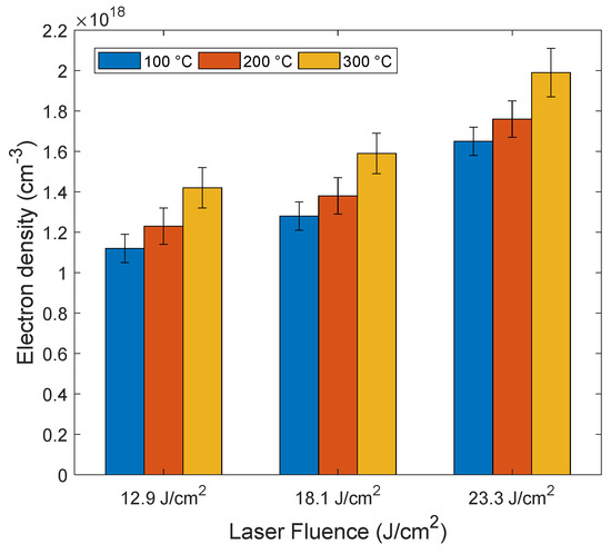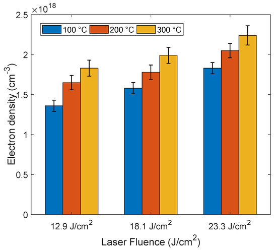 Figure 9 presents the electron density of the Mg plasma as a function of laser fluence at different sample temperatures (100, 200 and 300 °C) at a delay time of 3 µs. The maximum value of the electron density was obtained as c with a sample temperature of 300 °C at a laser fluence of 23.3 J cm−2. From this graph it can be seen that the electron density drops with higher laser fluences.
