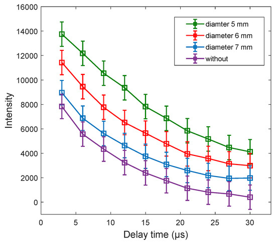 The spectral intensity of the plasma can be improved by the cavity confinements, while the performance of the cavity confinement itself is influenced by different factors such as its size, laser fluence and the wavelength. The size of the confinement plays a vital role in the plasma enhancement because of the plasma compression effect of the shock waves produced by the plasma within the cavity. Throughout this experiment we employed circular and square cavities with three different sizes and investigated the effect of the sizes on the laser-induced Ti plasma. Figure 11 shows the spectral peak intensities of the Ti plasma confined with three different sizes of the circular cavity. We observed that the circular cavity with the 5 mm diameter produced the greatest spectral peak intensity of the Ti II–318.2 nm spectral lines. By comparing the spectral intensities of the confinement of the circular cavity with 5 mm diameter to the one without confinement, it was found that the spectral intensity of the former was significantly enhanced with an enhancement factor of 1.76. We attributed these signal enhancements to the compression effect of the shock wave. In addition, by comparing the three circular cavity sizes as seen from Figure 11, we found that the 5 mm diameter cavity had the best enhancement. From our results we observed that the smaller cavity size had the higher spectral intensity enhancement. As the plasma cools down, the spectral intensities of the lines then drops with time [51,52]. From the time-resolved emission intensities in Figure 11, we observed that the line intensities of the Ti II–318.2 nm decays exponentially with increasing delay time.
