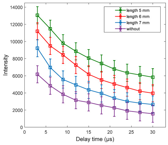The temporal evolution of the Ti II–376.2 nm lines is also shown in Figure 6b. The peak intensities of the Ti II–376.2 nm lines were recorded as 14,056 and 17,124 with sample temperatures of 100 and 300 °C, respectively. We found that the spectral intensity of the 300 °C sample temperature was significantly enhanced. We also observed a sharp decrease in the peak intensities by increasing the delay time. From these results we can see that increasing the sample temperature has a massive effect on the emission intensities of the plasmas.