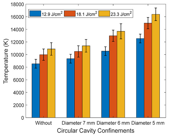In addition, comparing the electron temperatures of the circular cavities in Figure 13 and the square cavities in Figure 14, it can be seen that the circular cavities with a 5 mm diameter had the highest electron temperature of 16,389 K.