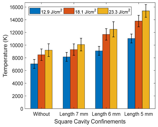 The electron temperature of the Ti plasma confined in circular and square cavities was deduced from the Saha–Boltzmann’s equation. The electron temperature was calculated from the slope of the linear plot for the Ti plasma. For the case without the cavity confinement the electron temperature was found to be 8546 K with a laser fluence of 12.9 J cm−2. After employing a circular cavity with a 5 mm diameter, we recorded the electron temperature to be 12,546 K with a laser fluence of 12.9 J cm−2. Figure 13 and Figure 14 show the plots of the electron temperature against the different sizes of the circular and square cavities respectively. From these plots we found that the electron temperature increases with higher laser fluences. We also observed that as the size of the circular and the square cavities decreased, the electron temperatures increased. Moreover, after comparing the electron temperature of the case without cavity confinement with the square cavity confinement it was found that the electron temperature of the latter was more enhanced, as seen in Figure 14.