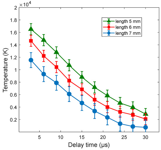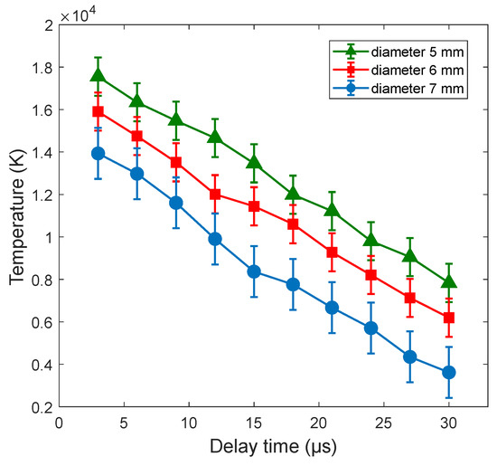 The time-resolved electron temperatures of the Mg and Ti plasmas confined with circular cavity of different sizes at a laser fluence of 23.3 J cm−2 are presented in Figure 15 and Figure 16, respectively. We observed that for the Mg plasma, the maximum electron temperature reached 17,552 K at a delay time of 3 µs. By increasing the delay time to 30 µs the electron temperature rapidly dropped to 7835 K. Moreover, the Ti plasma also had its maximum electron temperature of 16,509 K at a delay time of 3 µs. As Figure 15 shows, with further increase in the delay time, the electron temperature sharply drops to its minimum electron temperature of 2786 K at 30 µs.